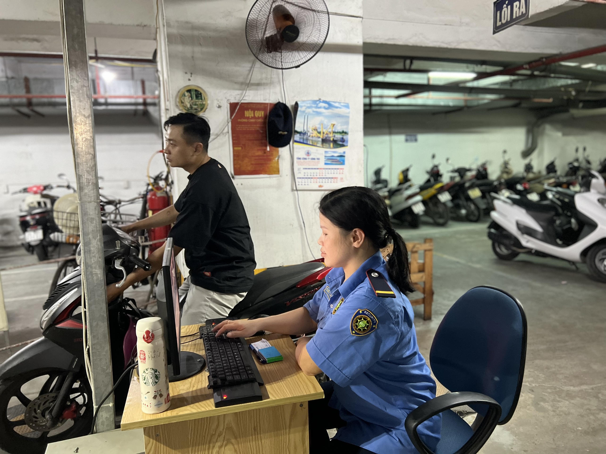 Chị Nguyễn Thị Vân, 38 tuổi, quê ở Hà Giang, thấy mình phù hợp với công việc bảo vệ - trông xe chung cư. |