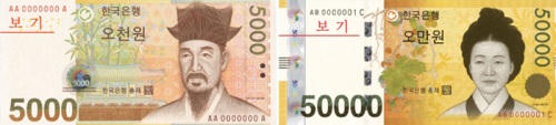 Đằng sau hai tờ tiền này là một bí mật mà khó có thể tìm thấy ở bất cứ tờ tiền nào trên thế giới. Điểm đặc biệt ở đây là hai nhân vật khắc họa trên tờ 5.000 won và 50.000 won là hai mẹ con: Shin Saimdang và con trai Yulgok Yi I.