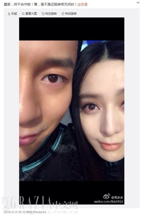 13/3/2014 – Lần đầu tiên đăng ảnh chụp chung: Trên trang Weibo cá nhân của mình, ngôi sao họ Phạm lần đầu tiên đăng ảnh chụp chung giữa cô và Lý Thần. Trong ảnh hai người tựa đầu vô cùng thân mật, ánh mắt toát lên vẻ hạnh phúc. Tuy nhiên bức ảnh với dòng caption: “Thần ca, cuối cùng cũng hợp tác! Nhìn kìa, chẳng phải cũng thân mật quá đỗi sao” chỉ đủ khiến dư luận bán tín bán nghi về tình tỷ - đệ 10 năm của hai người.