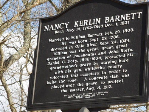 "Nancy Kerlin Barnett, sinh 14/5/1793 – mất 1/12/1831, kết hôn với William Barnett ngày 29/2/1808. Ông sinh ngày 27/9/1786, chết đuối tại sông Ohio vào ngày 24/9/1854. William là cháu 5 đời của gia đình Pocahontas và John Rolfe.