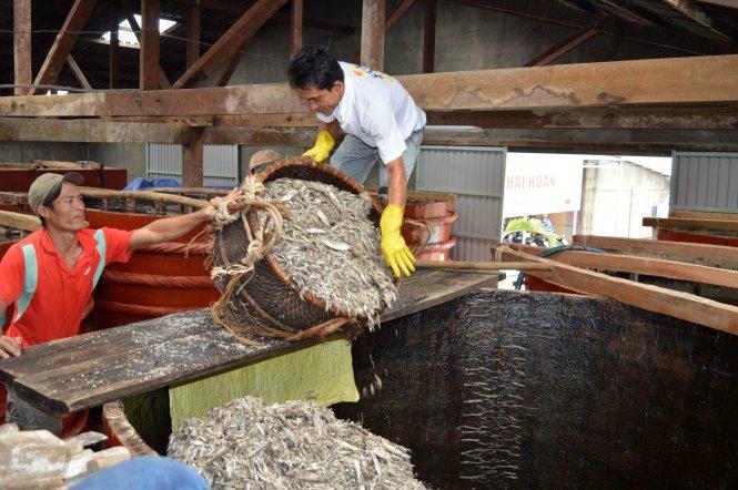 Đổ cá vào thùng chượp (đã ướp muối) ở một nhà thùng tại Phú Quốc (Ảnh: Tuổi trẻ). |