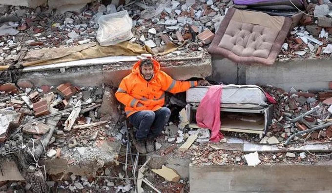 Các gia đình cố đào bới đống đổ nát để tìm kiếm những người thân đang bị chôn vùi bên dưới. Tuy nhiên, một người đàn ông mặc áo khoác màu cam ngồi lặng lẽ giữa đống đổ nát đã lọt vào mắt của Adem Altan.