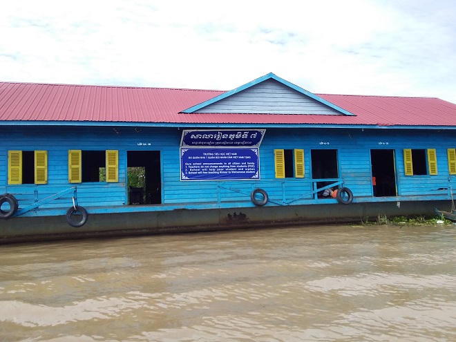 Trên Biển Hồ mênh mông, giữa những mái nhà lúp xúp là ngôi bè khang trang nổi bật với những bức tường bằng gỗ sơn màu xanh da trời, mái tôn đỏ au. Tấm bảng lớn bằng ba thứ tiếng: Campuchia, Việt, Anh. Dòng chữ tiếng Việt nổi bật: Trường tiểu học Việt Nam do Quân khu 7 Quân đội nhân dân Việt Nam tặng.