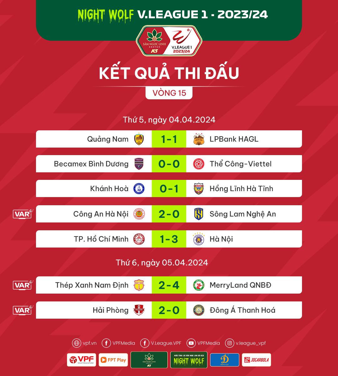 Hai trận đấu còn lại của vòng 15 diễn ra chiều 5/4, CLB MerryLand Quy Nhơn Bình Định bất ngờ giành chiến thắng đậm 4-2 trước Thép Xanh Nam Định ngay trên sân Thiên Trường trong trận đấu Leonardo Artur toả sáng rực rỡ. Đây là chiến thắng bất ngờ nhất của vòng đấu này khi mà mọi dự đoán của giới chuyên môn đều nghiêng về đội chủ sân Thiên Trường.