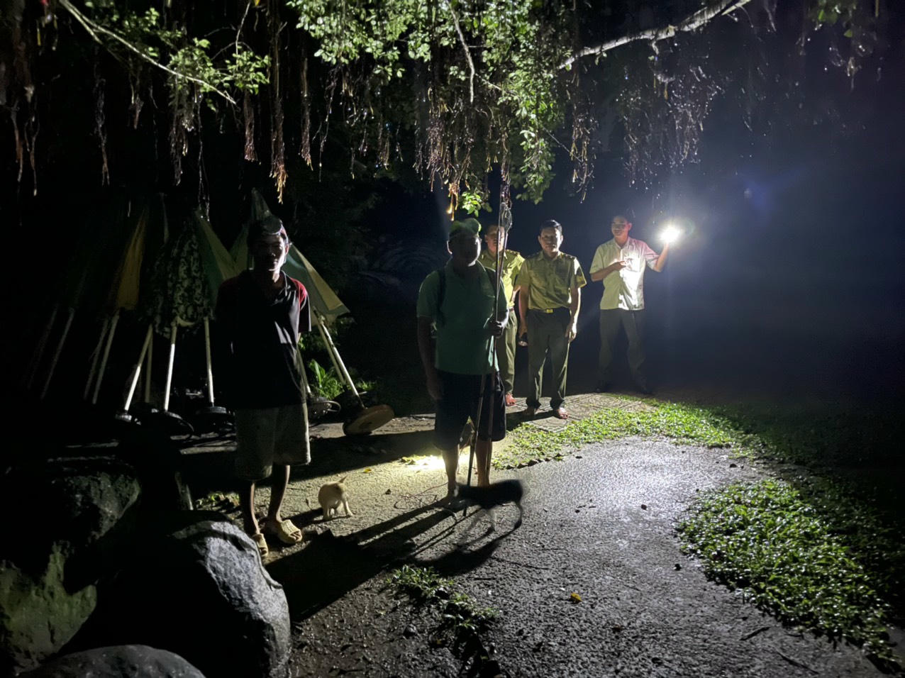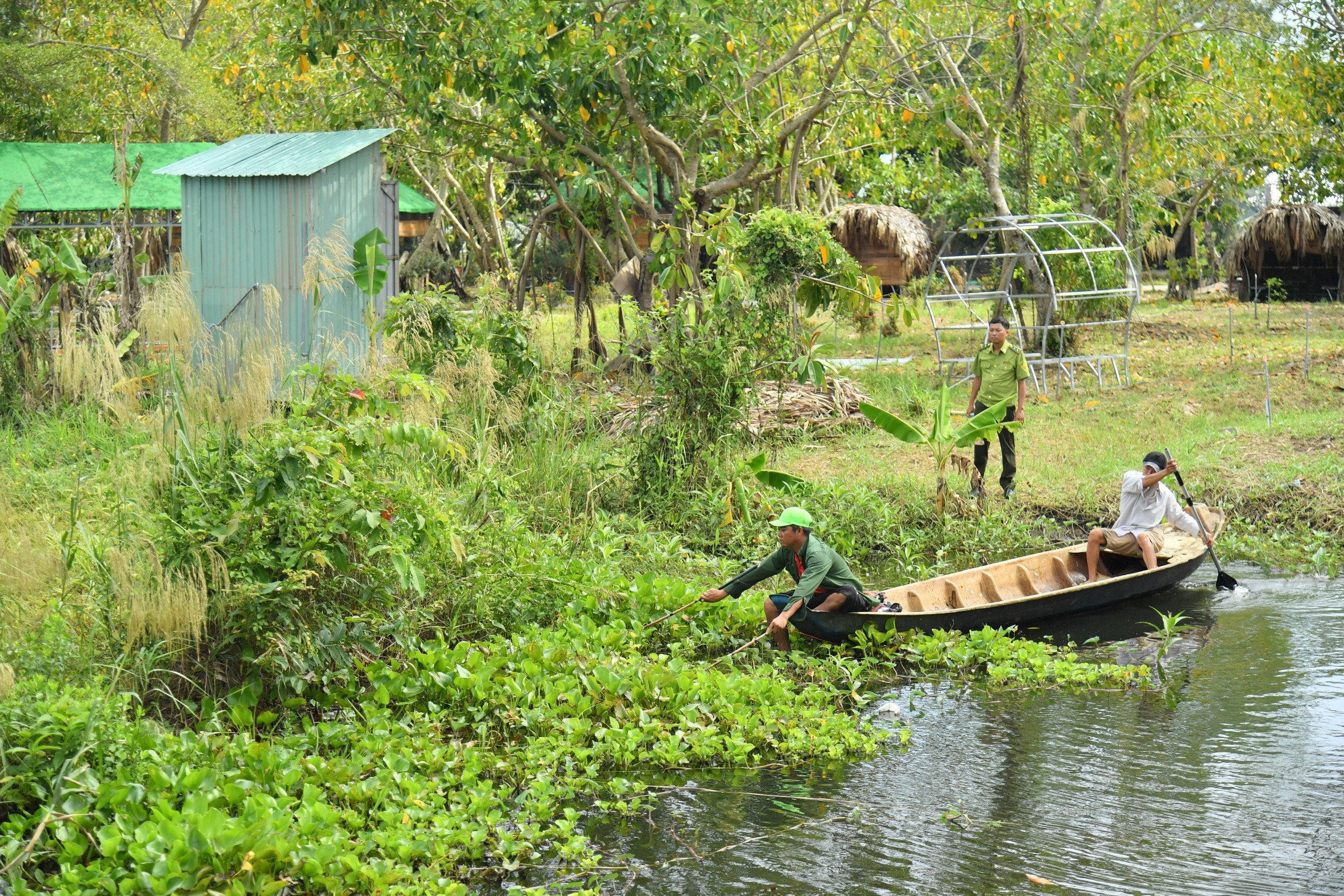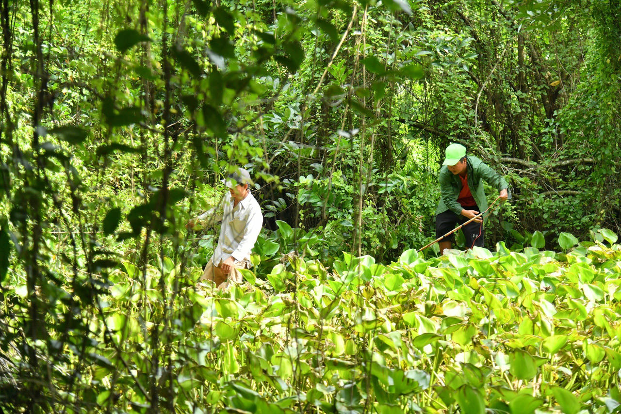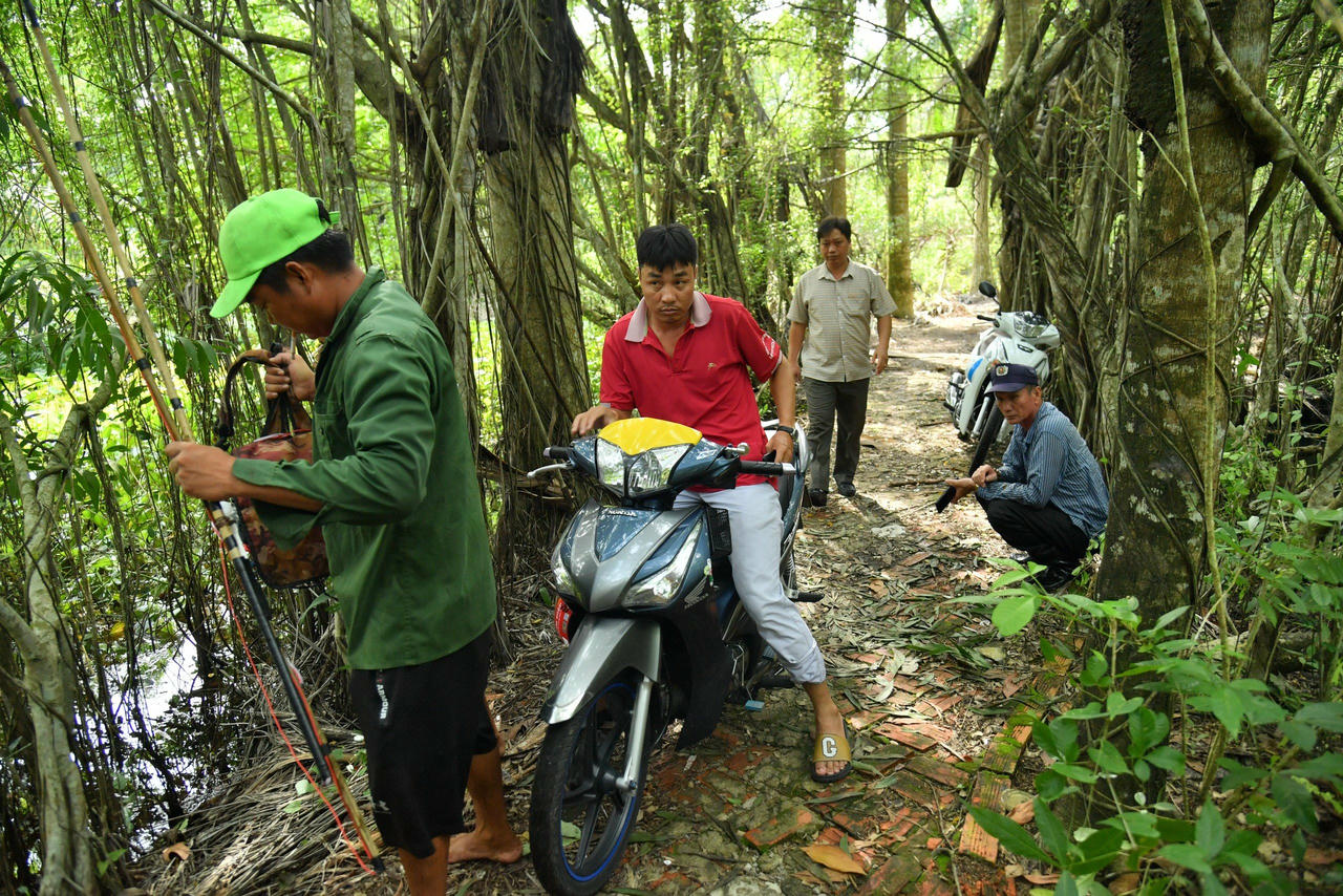 Hình ảnh lực lượng chức năng địa phương truy tìm cá sấu sổng chuồng: