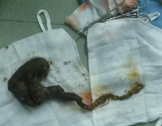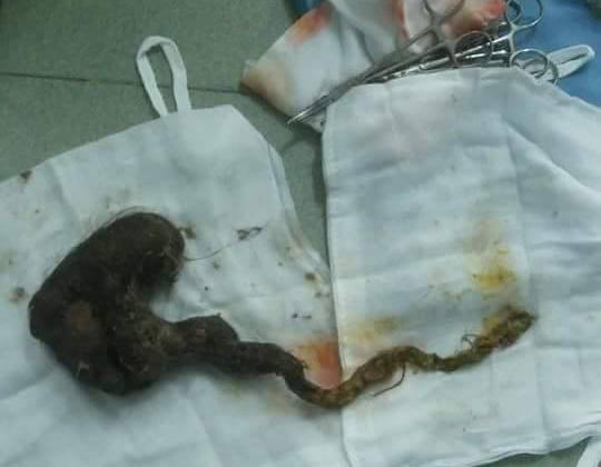 Các bác sĩ đã cố gắng lôi ra một búi tóc có nhiều sợi tóc quấn chặt vào nhau nặng khoảng 4 kg trong bụng bệnh nhân. Họ cho rằng nếu không được mổ cấp cứu, người bệnh có thể sẽ chết.