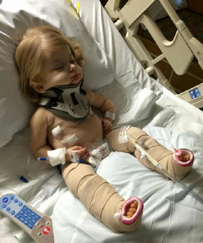 Bên cạnh đó, bé đã được các bác sĩ chèn thanh kim loại vào chân và tay từ tháng 7/2016, đồng thời các bác sĩ cũng tiến hành phẫu thuật cổ để cố định cột sống của bé. Hiện hàng ngày bé đang phải đeo nẹp cổ và ngồi trên xe lăn để tiến hành đủ loại phương pháp điều trị.