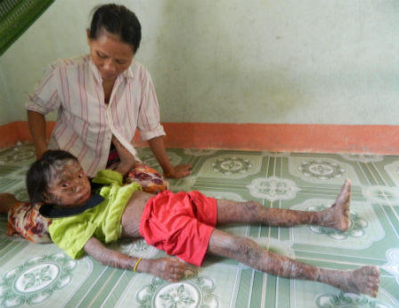 Gần 10 năm nay gia đình chị Viên sống trong nỗi lo lắng, vì bị người dân trong làng sợ hãi xa lánh bởi đứa con có hình dáng kỳ dị, da thịt thường xuyên bị bong tróc, người lở loét hôi hám.