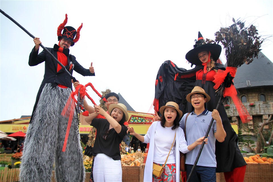 Quảng trường Du Dôme mùa Halloween nhuộm trong sắc vàng của rơm khô, bí ngô và rực rỡ những sắc hoa tươi. Nhà bí ngô khổng lồ, mô hình gia đình nhà bí đáng yêu hay những trái bí tí hon được tạo hình ngộ nghĩnh, những hình nhân bằng rơm đáng yêu…, hàng chục ngàn trái bí ngô được khéo léo sắp xếp, tạo hình để tạo nên những mô hình tiểu cảnh trang trí hệt như trong cổ tích. Cô bé quàng khăn đỏ bước ra từ một ngôi nhà bí ngô, anh chàng Aladin cưỡi tấm thảm bay… những nhân vật trong cổ tích “bằng xương bằng thịt” hội ngộ tại Bà Nà, và sẵn sàng “diễn” cùng du khách trong những bức hình đẹp ngoạn mục chẳng thể có được ở bất cứ nơi nào khác.