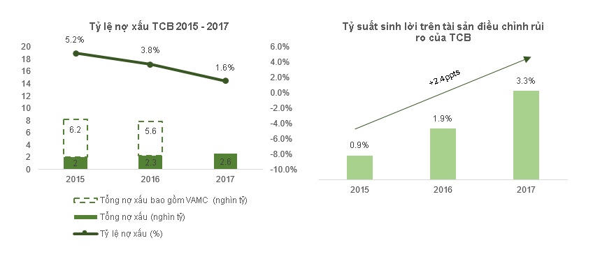 Khi kiên trì áp dụng chiến lược trên, ngân hàng này đã thành công trong việc tăng tỷ trọng cho vay ngắn hạn và sở hữu một danh mục cho vay với 88% các khoản vay có tài sản đảm bảo. Đồng thời, tỷ lệ nợ xấu cũng như các khoản trích lập dự phòng liên tục giảm qua các năm đã giúp đẩy mạnh hiệu quả hoạt động của mô hình Quản trị rủi ro tập trung. Trái ngọt của Techcombank là sự tăng trưởng liên tục của Tỷ suất sinh lời trên tài sản điều chỉnh rủi ro. Từ năm 2015 đến nay tỷ suất này đã tăng từ mức 0.9% lên 3.3% năm 2017. Đây là vế hai của phương châm “Rủi ro thấp, lợi nhuận cao”.