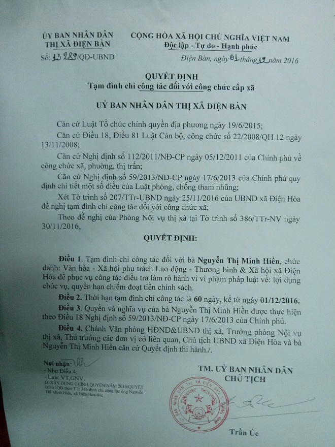 Ông Hải cũng cho biết, theo kiến nghị của xã, ngày 1/12, Chủ tịch UBND TX. Điện Bàn đã ký quyết định số 13289/QĐ-UBND tạm đình chỉ công tác 60 ngày đối với bà Hiền. Hiện các cơ quan chức năng vẫn đang kiểm tra, xác minh sự việc.