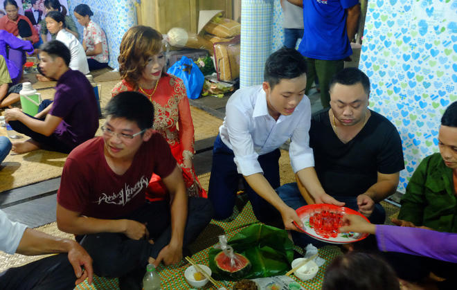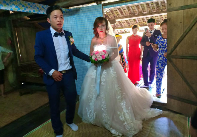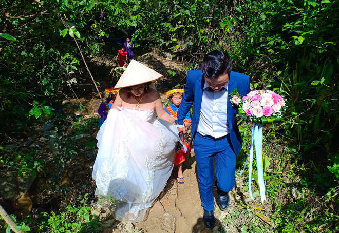 Sau khi đón dâu tại TP Cao Bằng, cô dâu, chú rể và đoàn rước dâu đã phải vượt qua quãng đường 40 km. Sau đó, cả đoàn phải đi bộ 2km đường rừng và trèo qua 3 con suối mới đến được nhà trai. Suốt chặng đường, dù trời nắng gắt, di chuyển gặp nhiều khó khăn, vất vả nhưng vợ chồng chị Sao luôn cười hạnh phúc.