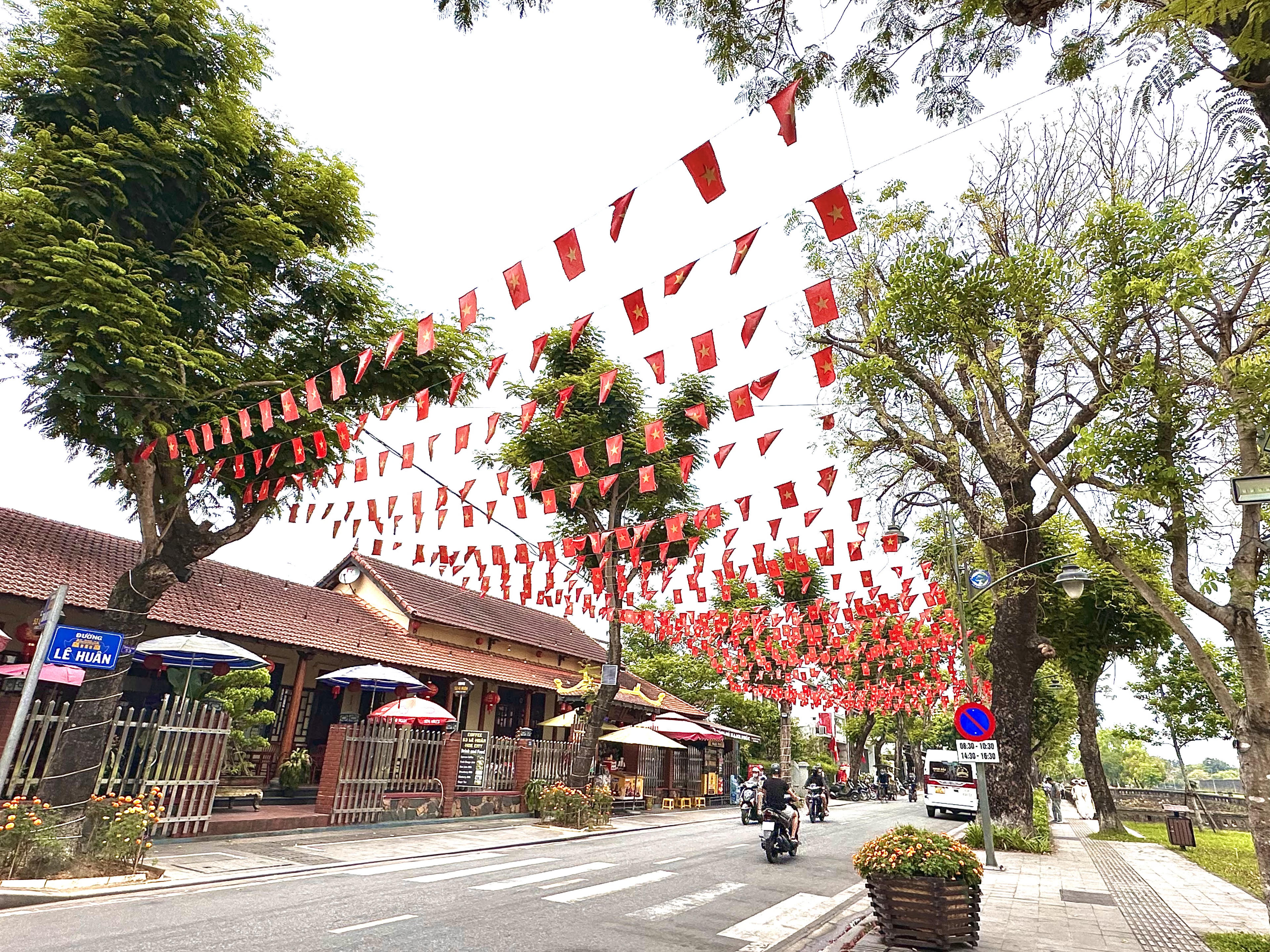 Nhiều tuyến đường ở TP Huế được trang hoàng rực rỡ. |