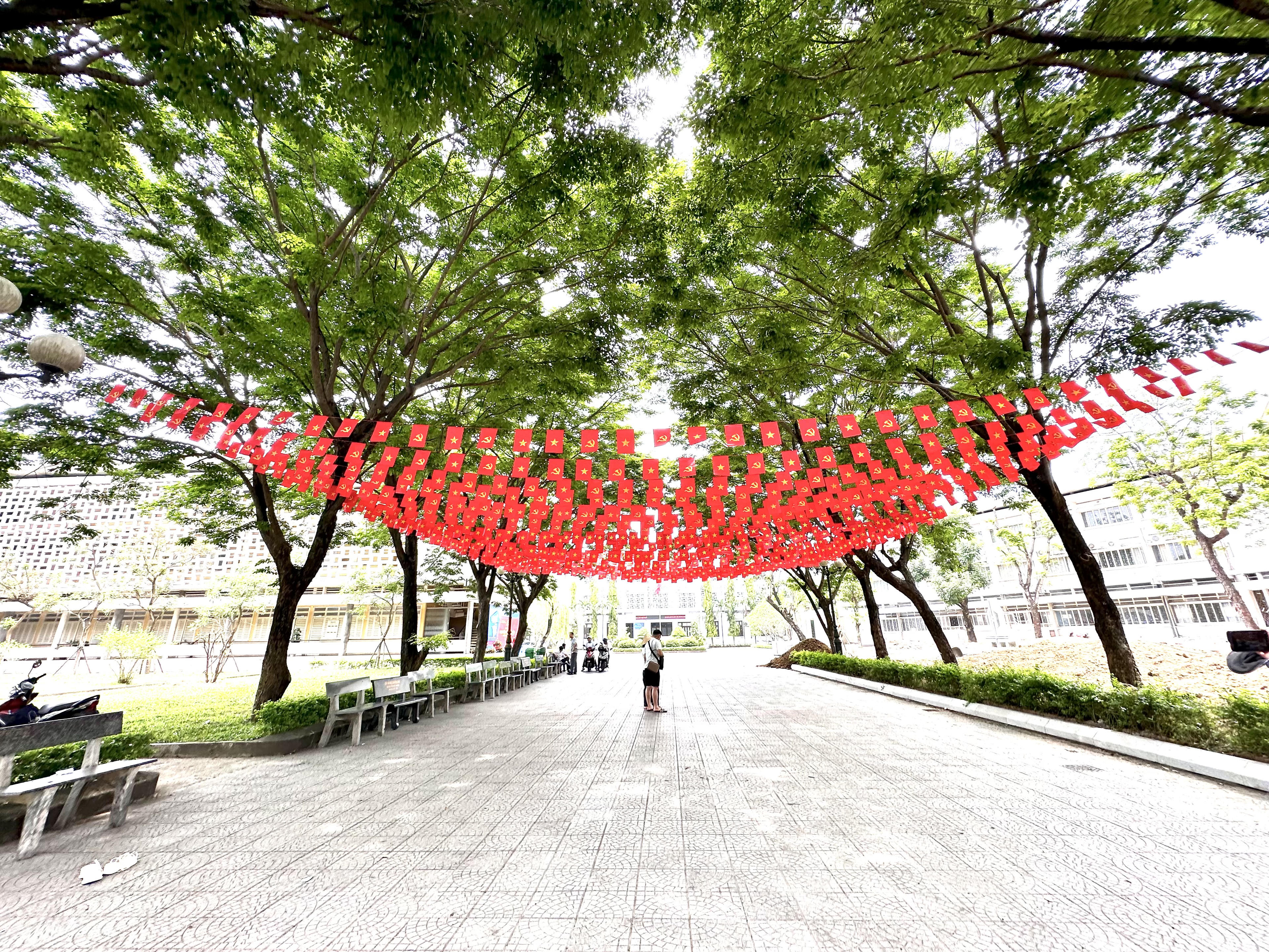 Ngoài trường Đại học Phú Xuân, trường Đại học Sư Phạm, Đại học Huế cũng được trang hoàng hàng trăm lá cờ Tổ quốc và cờ Đảng, tạo nên không gian đầy tự hào và ý nghĩa.