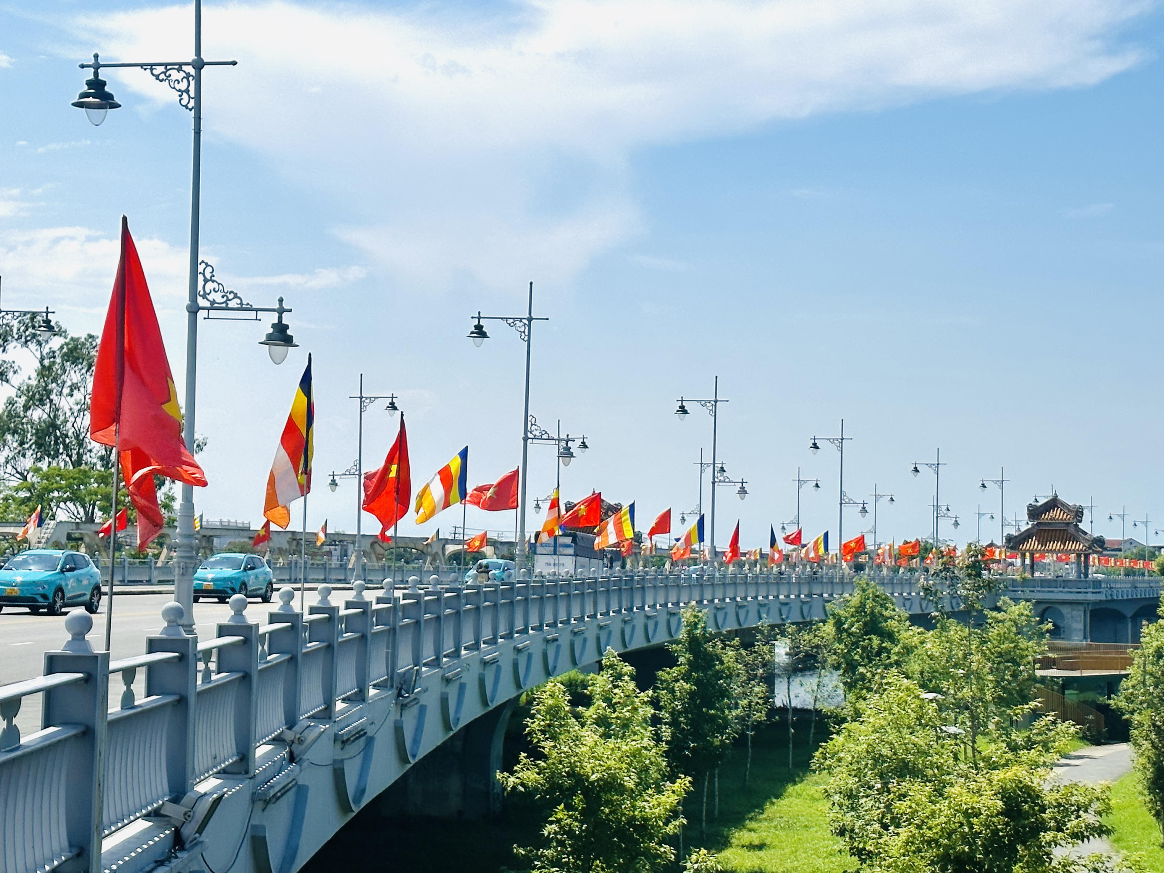 Màu sắc Phật giáo tràn ngập trên nhiều tuyến đường đã tạo nên một nét đẹp rất riêng cho Huế. |