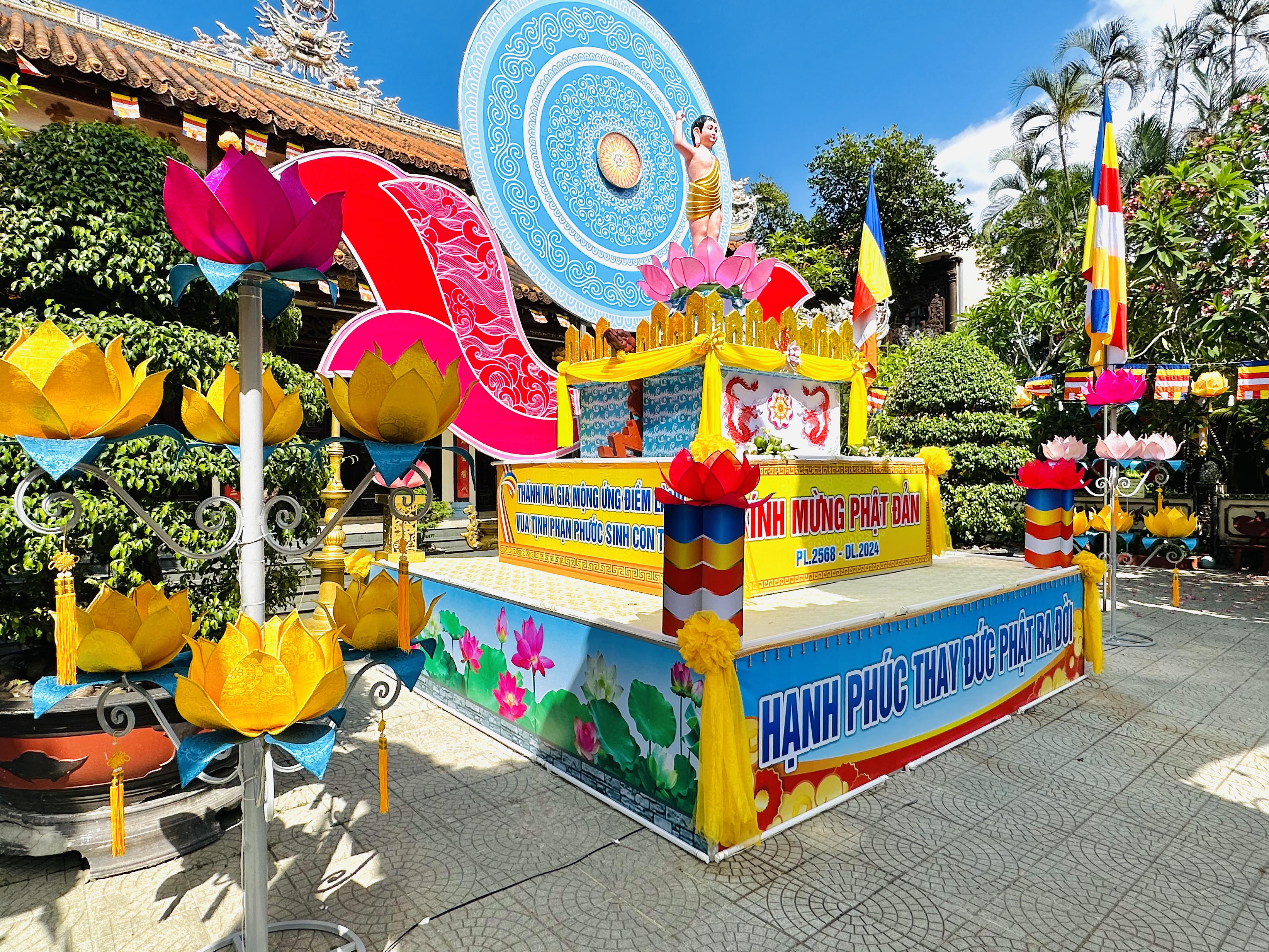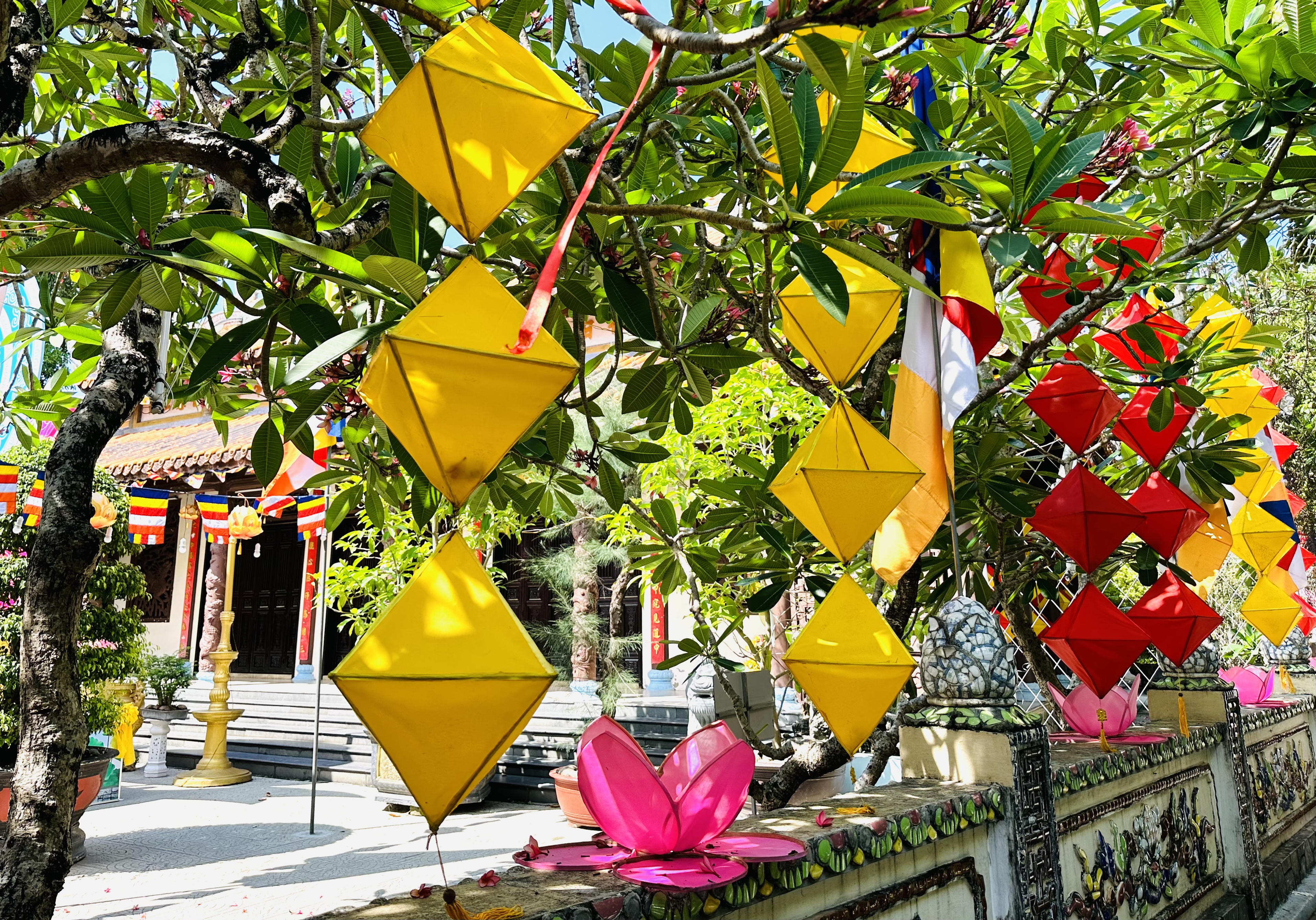 Hoe sen, lồng đèn tô điểm thêm sắc màu cho không gian Phật giáo. |