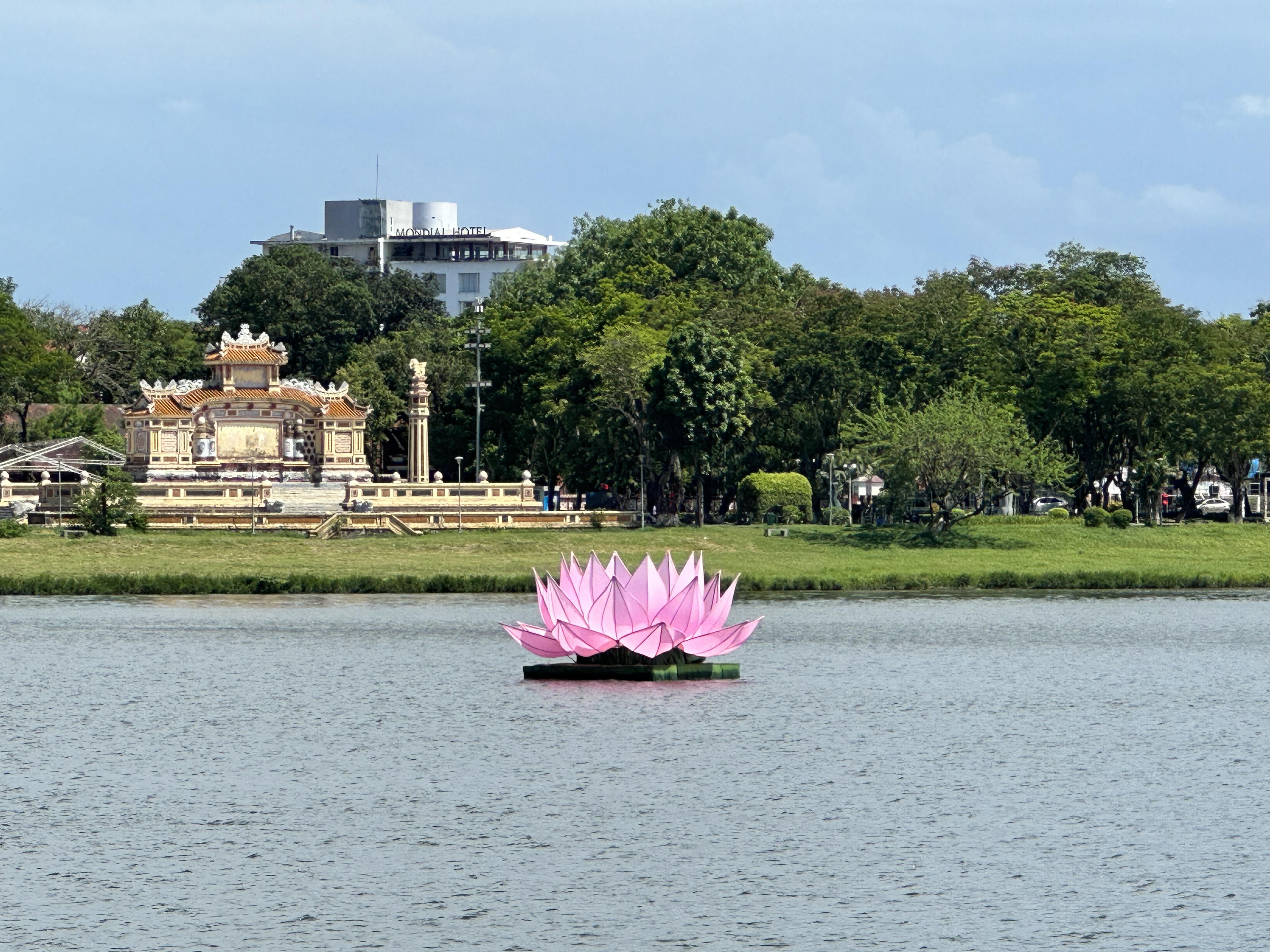Trên sông Hương, đoạn trước bến Nghinh Lương Đình, nhiều du khách thích thú khi thấy 7 đóa hoa sen khổng lổ lững lờ trôi trên sông Hương thơ mộng.