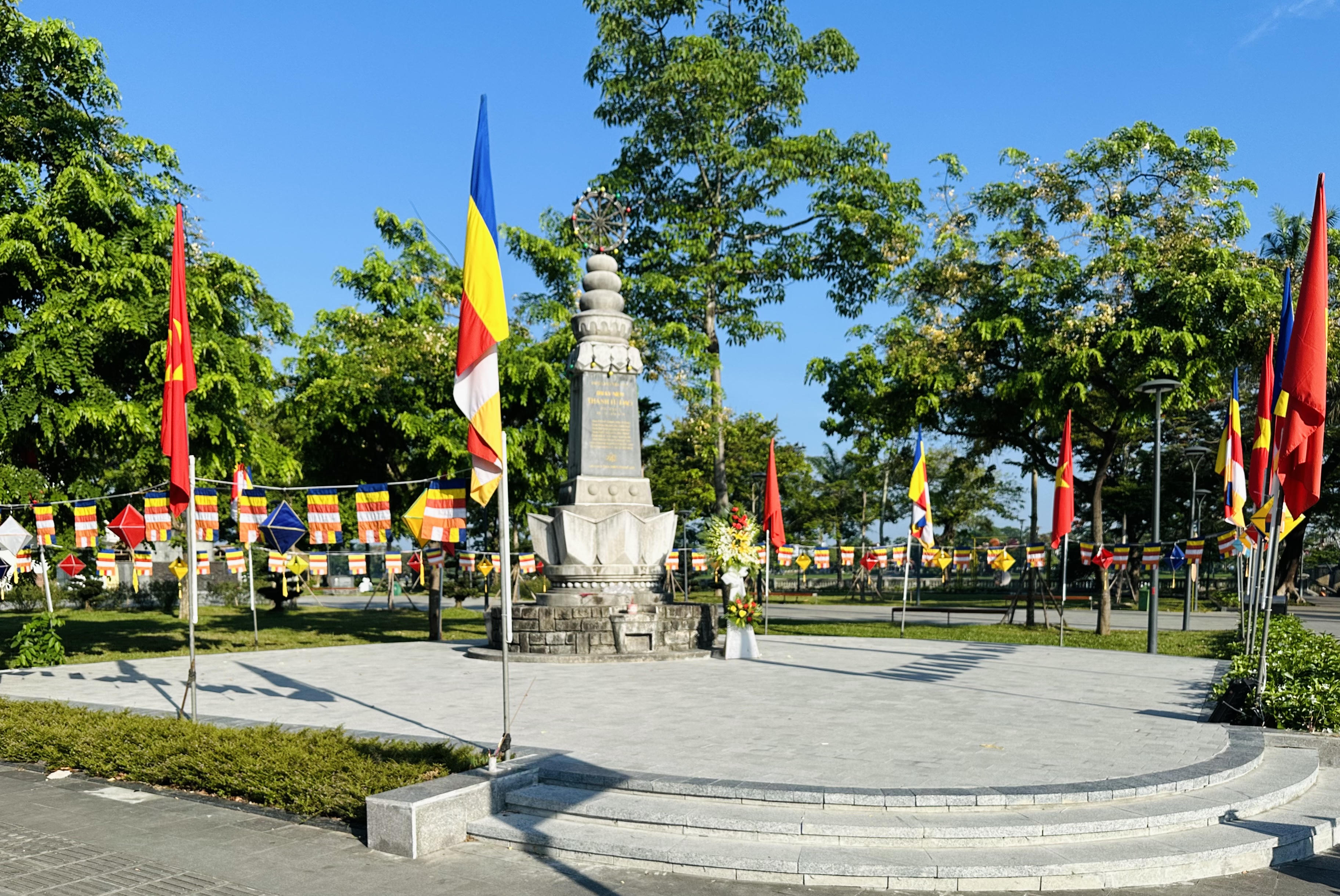 Đài tưởng niệm Thánh Tử đạo cũng được trang hoàng cờ Phật. |
