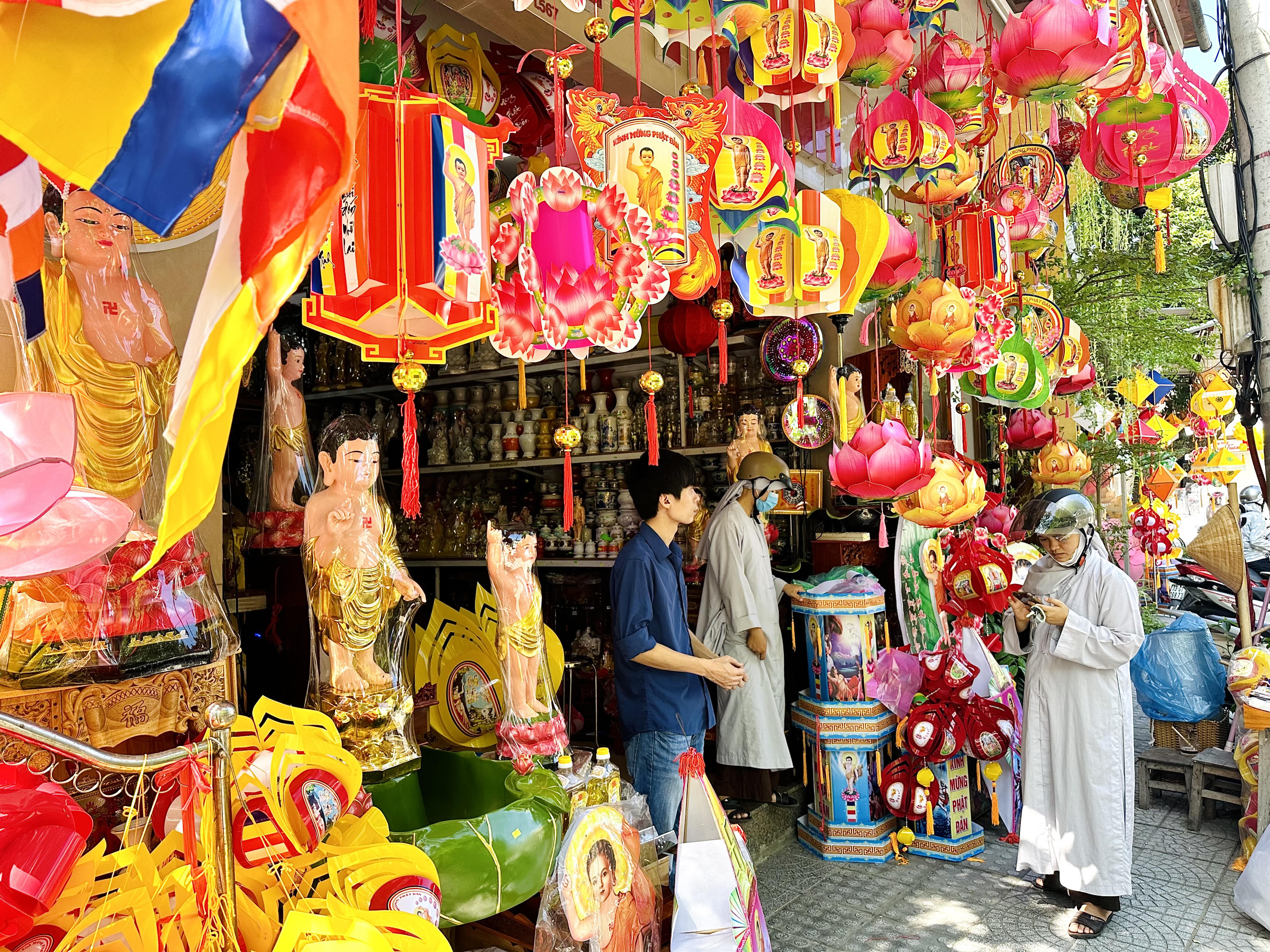 Hoa sen và lồng đèn được chuẩn bị đón mừng ngày đức Phật đản sanh. |