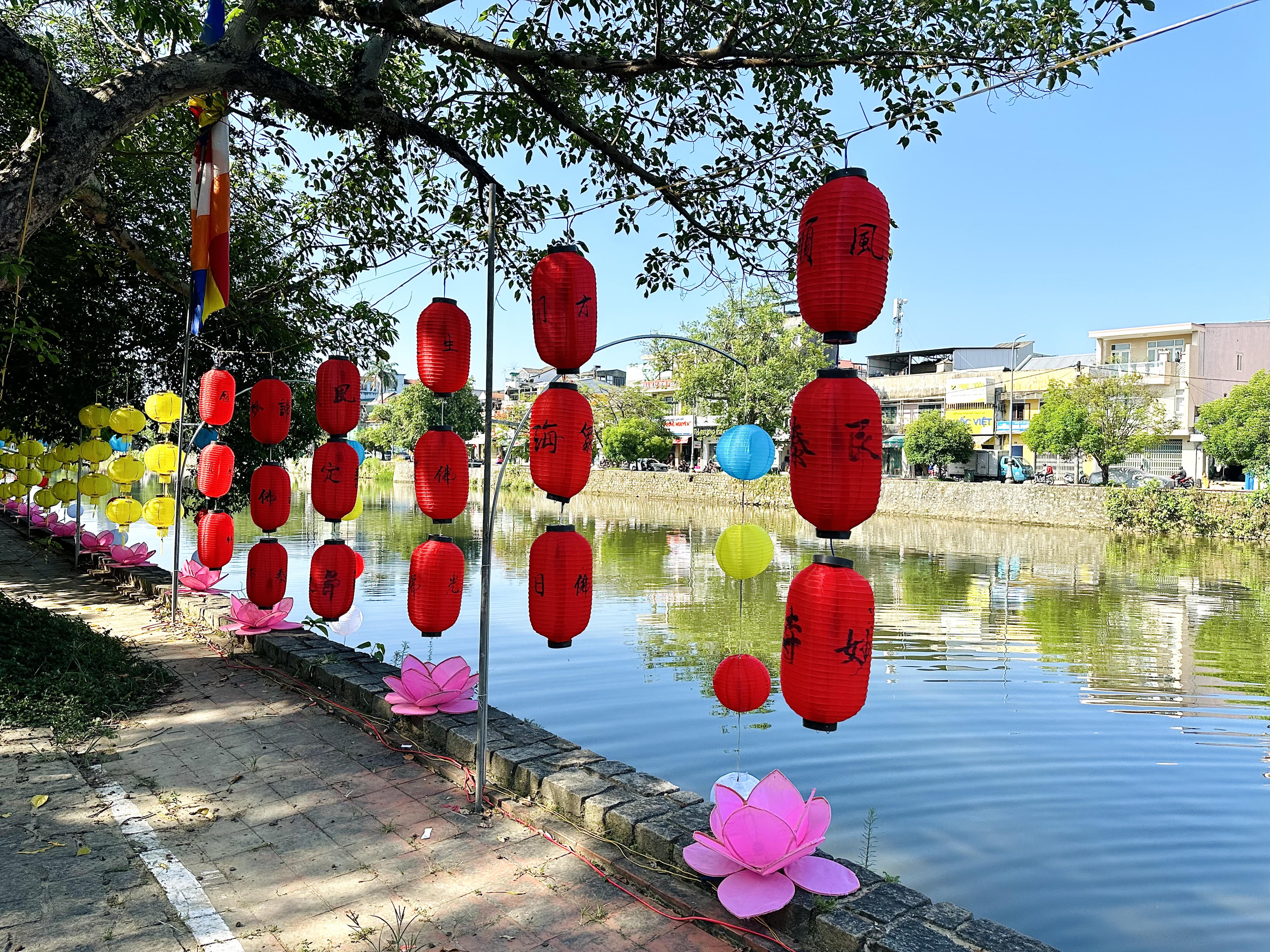 Trong thời gian diễn ra lễ Phật đản, trên các tuyến đường từ thành thị đến nông thôn đều được trang hoàng cờ đèn, tạo không khí hân hoan của người dân xứ Huế. |