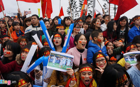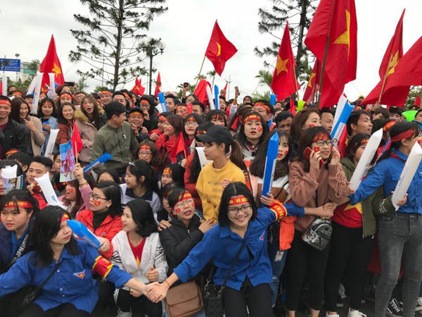 Dọc tuyến đường lên Sân bay Nội Bài và quanh phi trường này, sáng nay, 28/1 đỏ rực một màu đỏ với sao vàng tung bay. Hàng ngàn cổ động viên (CĐV) xếp hàng nhiều giờ chờ đón thầy trò HLV Park Hang Seo.
