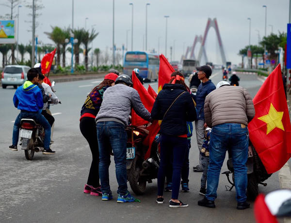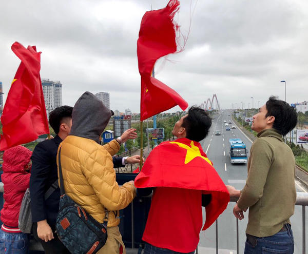 Cờ đỏ sao vàng rợp bay dọc đường lên Nội Bài chờ đón U23 Việt Nam