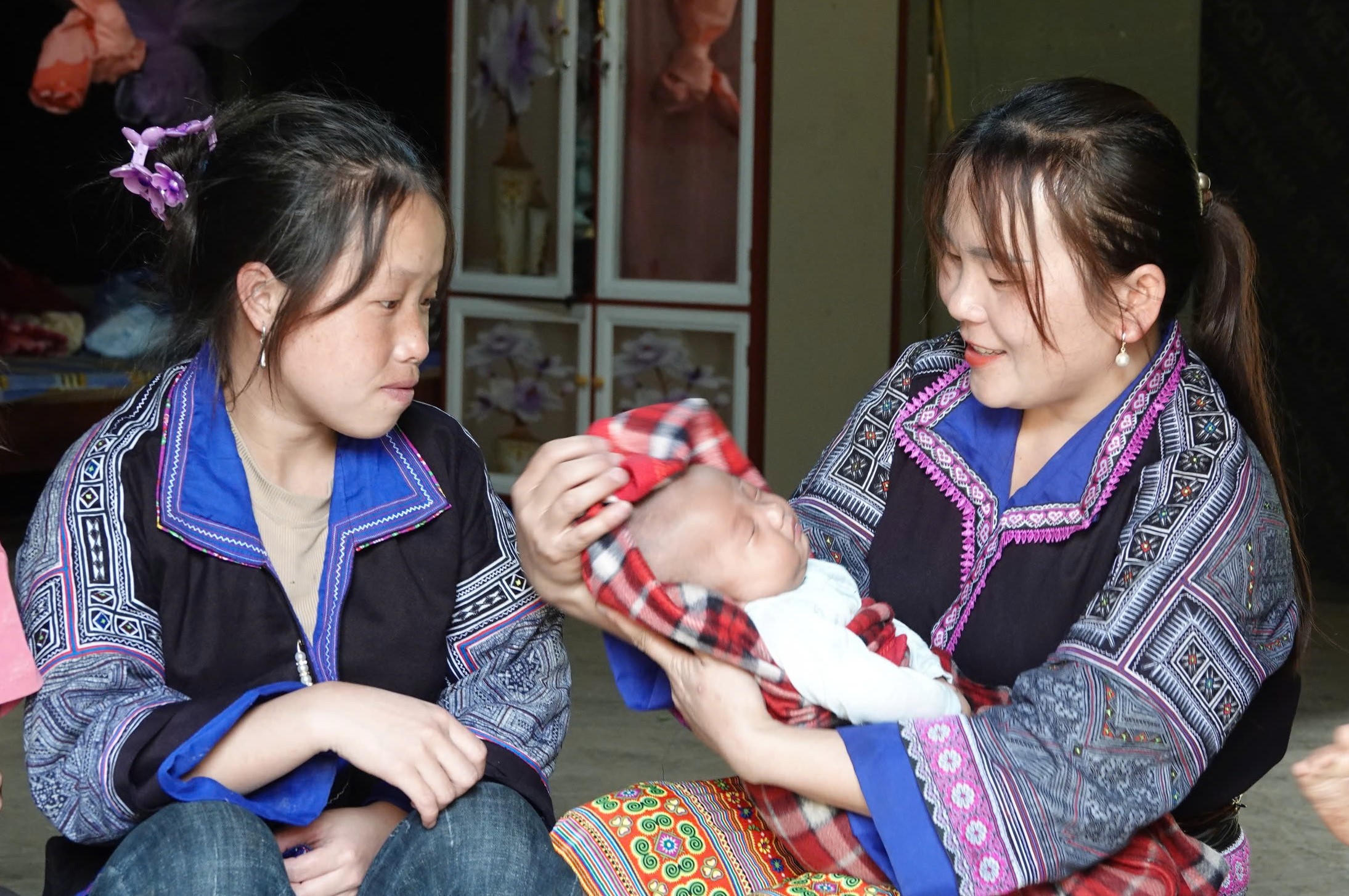 Bên căn nhà nằm khuất nẻo tại bản Pú Nhu Háng Sung, chị Hàng Thị Xe, sinh năm 2005, đang chăm sóc cho đứa con 9 tháng tuổi của mình. Chị Xe bùi ngùi nhớ lại khoảnh khắc “vượt cạn” hạ sinh đứa con thứ 3, khi đó nếu không có cô đỡ Hờ Thị Nhứ giúp đỡ thì chẳng biết số phận mẹ con chị sẽ ra sao.