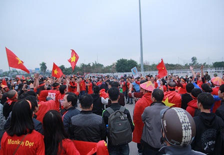 (PLO) -Ngay từ đầu giờ chiều, hàng đoàn cổ động viên mặc áo màu cờ đỏ sao vàng đã có mặt trước quảng trường sân vận động Mỹ Đình hô vang nhiều khẩu hiệu và bài hát cổ vũ tinh thần cho đội tuyển Việt Nam.