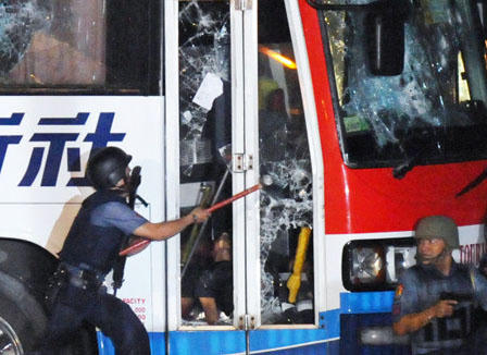 Qua máy truyền hình trên xe bus, Mendoza có thể theo dõi thông tin. Sau nhiều giờ đồng hồ thương lượng không có kết quả, lại bị kích động khi nhìn thấy hình ảnh người em trai, cũng là một cảnh sát viên, bị bắt đưa đi vì bị cho là đồng lõa với người anh, khoảng 19h20, Mendoza bắt đầu bắn con tin. Sau đó cảnh sát tấn công vào xe bus. Mendoza bị bắn chết vào lúc 20h41. Vụ khủng hoảng con tin kéo dài 11 giờ.