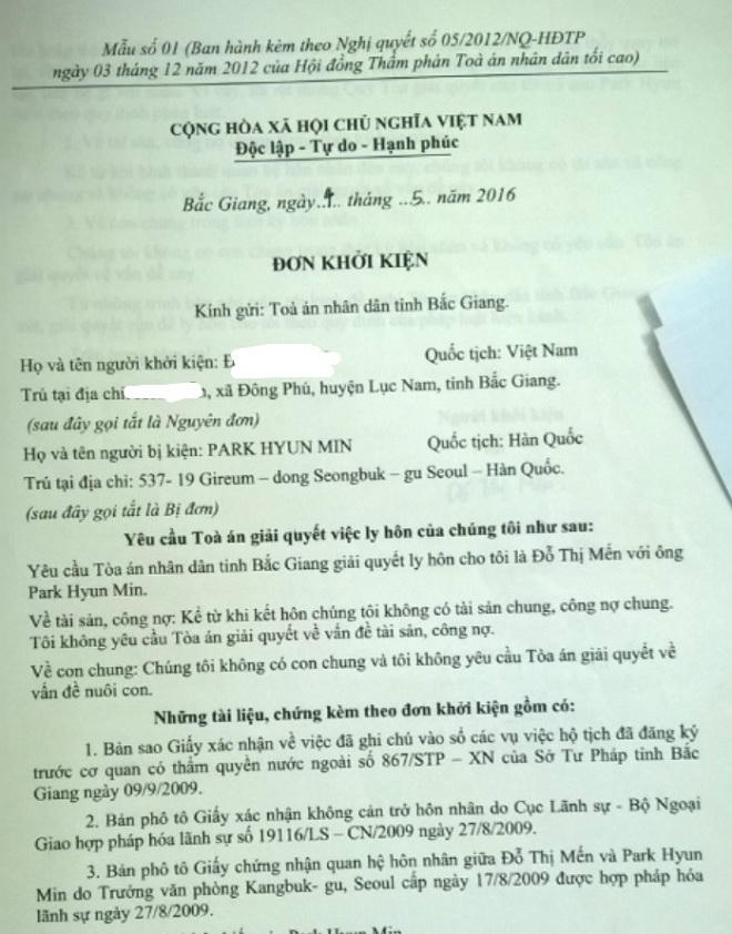 Mãi đến khi được luật sư hỗ trợ, cô gái mới đến Sở Tư pháp Bắc Giang trình bày hoàn cảnh và được cung cấp những giấy tờ chứng nhận quan hệ hôn nhân của mình. Theo đó chồng chị Mộng có tên đầy đủ Park Hyun Min (quốc tịch Hàn Quốc, địa chỉ đăng kí trong giấy kết hôn là: 537-19, Gireum- dong Seongbuk- gu, Seoul, Hàn Quốc).
