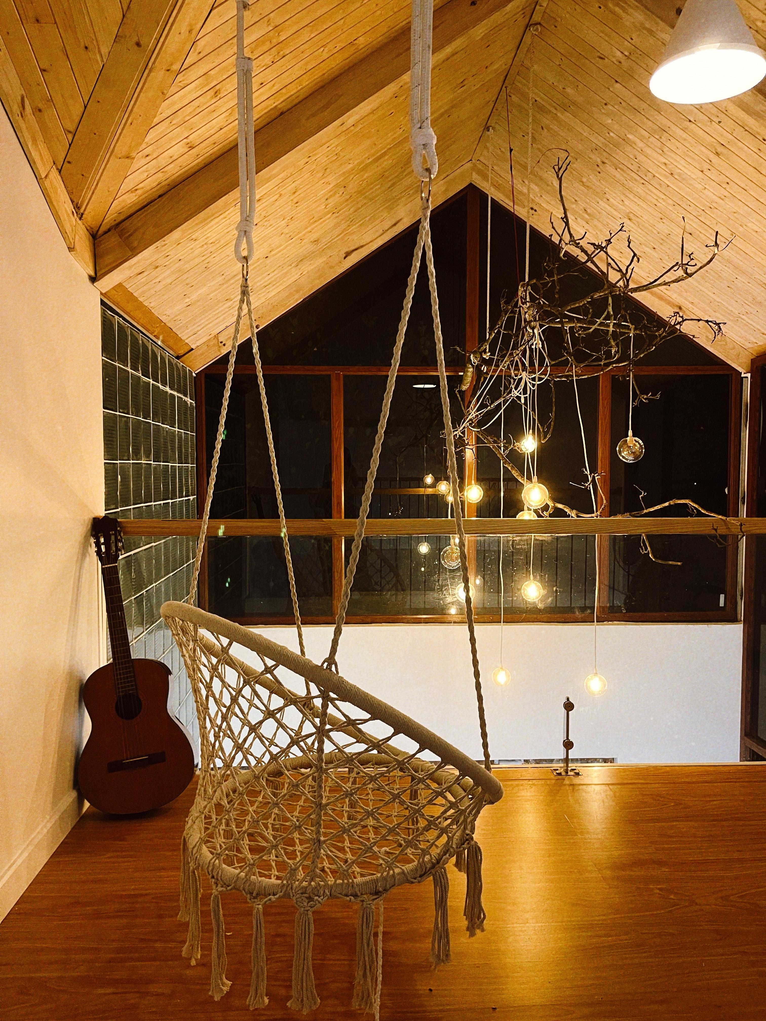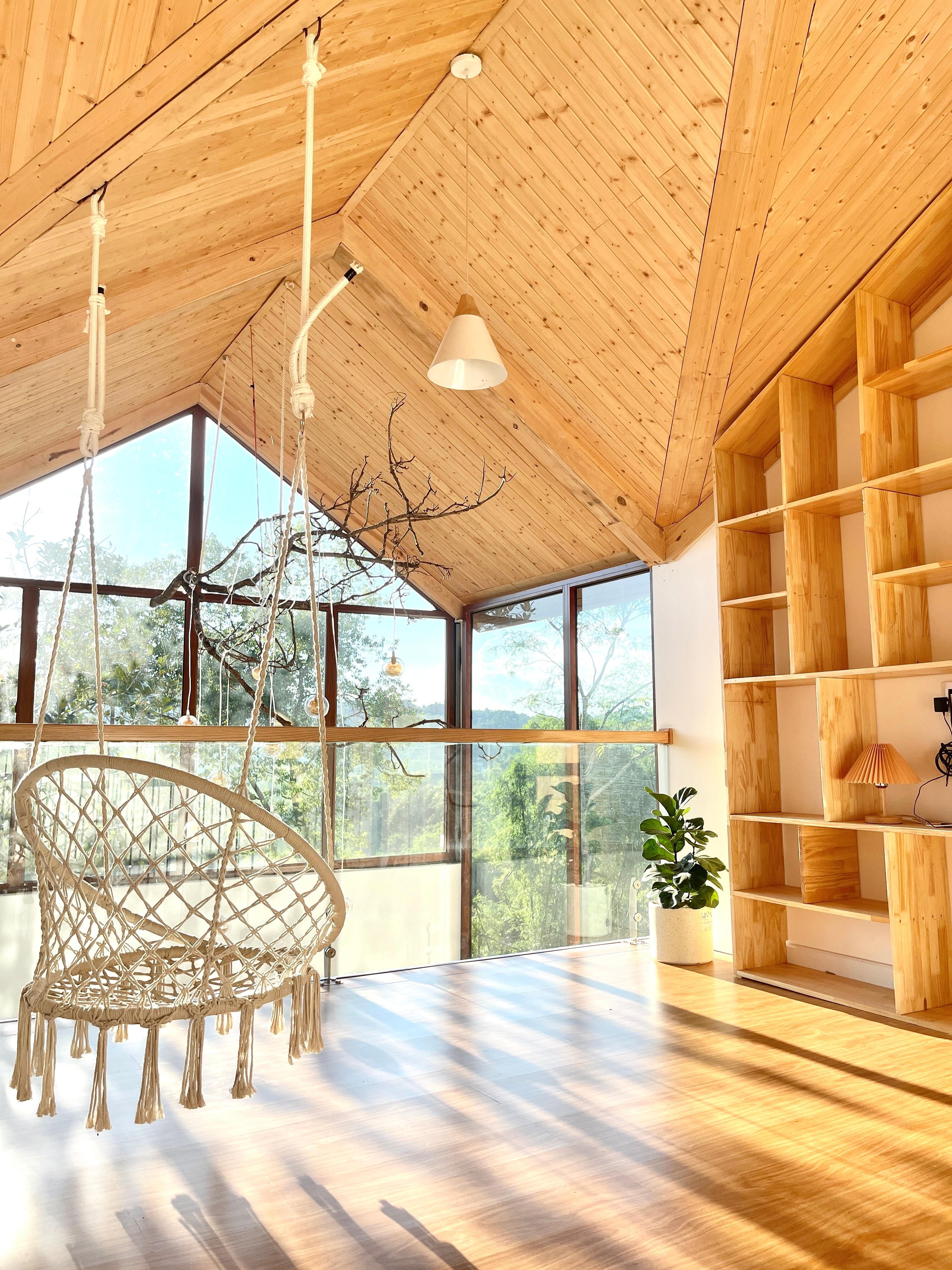 Phòng đọc sách, thư giãn trên tầng 2 của ngôi nhà được lắp thêm xích đu tạo điểm nhấn. Đây cũng là góc yêu thích của Minh Anh vào sáng sớm.