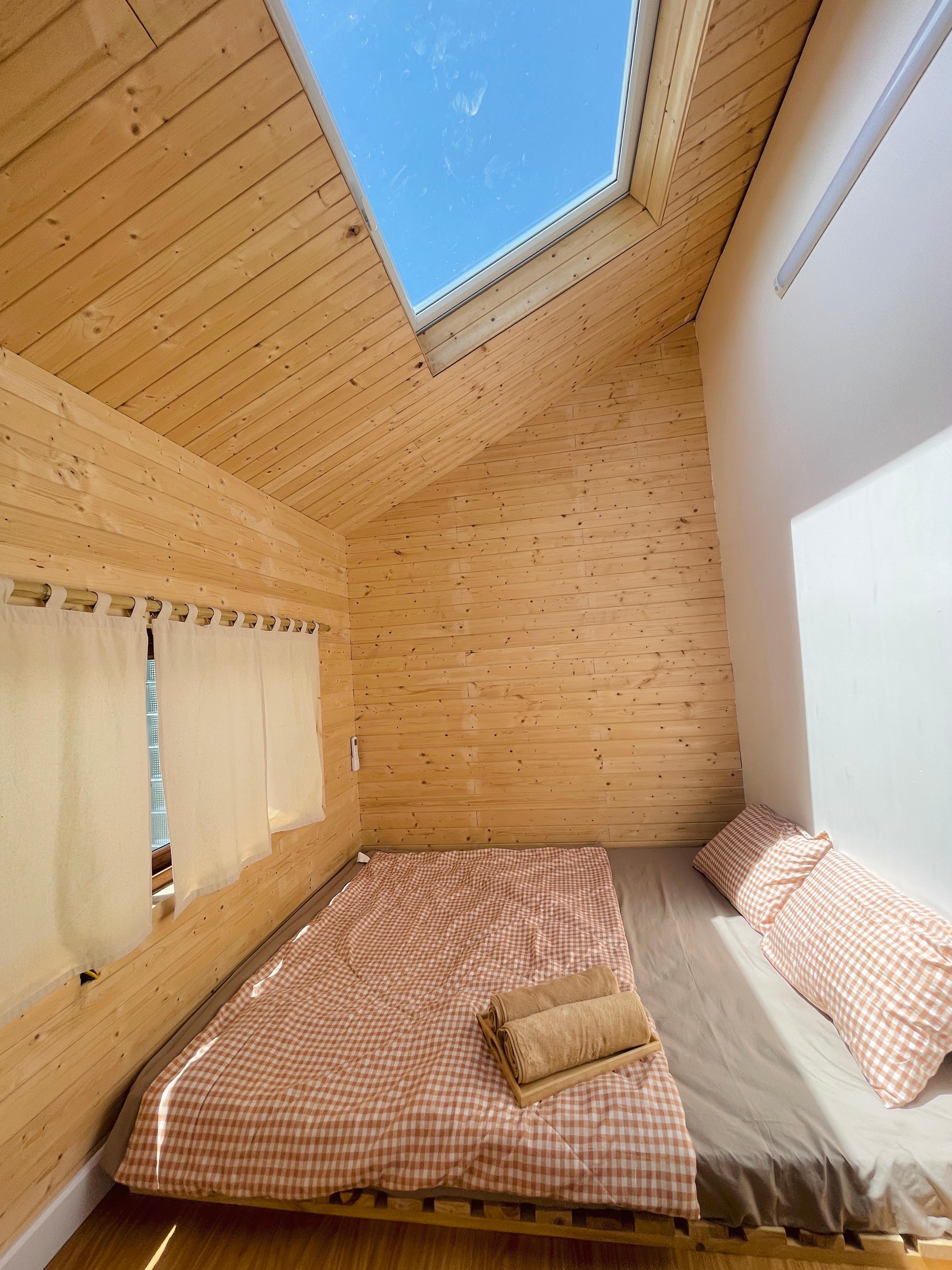 Phòng ngủ với giếng trời độc đáo. Phần giếng trời có cửa kính và hệ thống rèm che tự động.