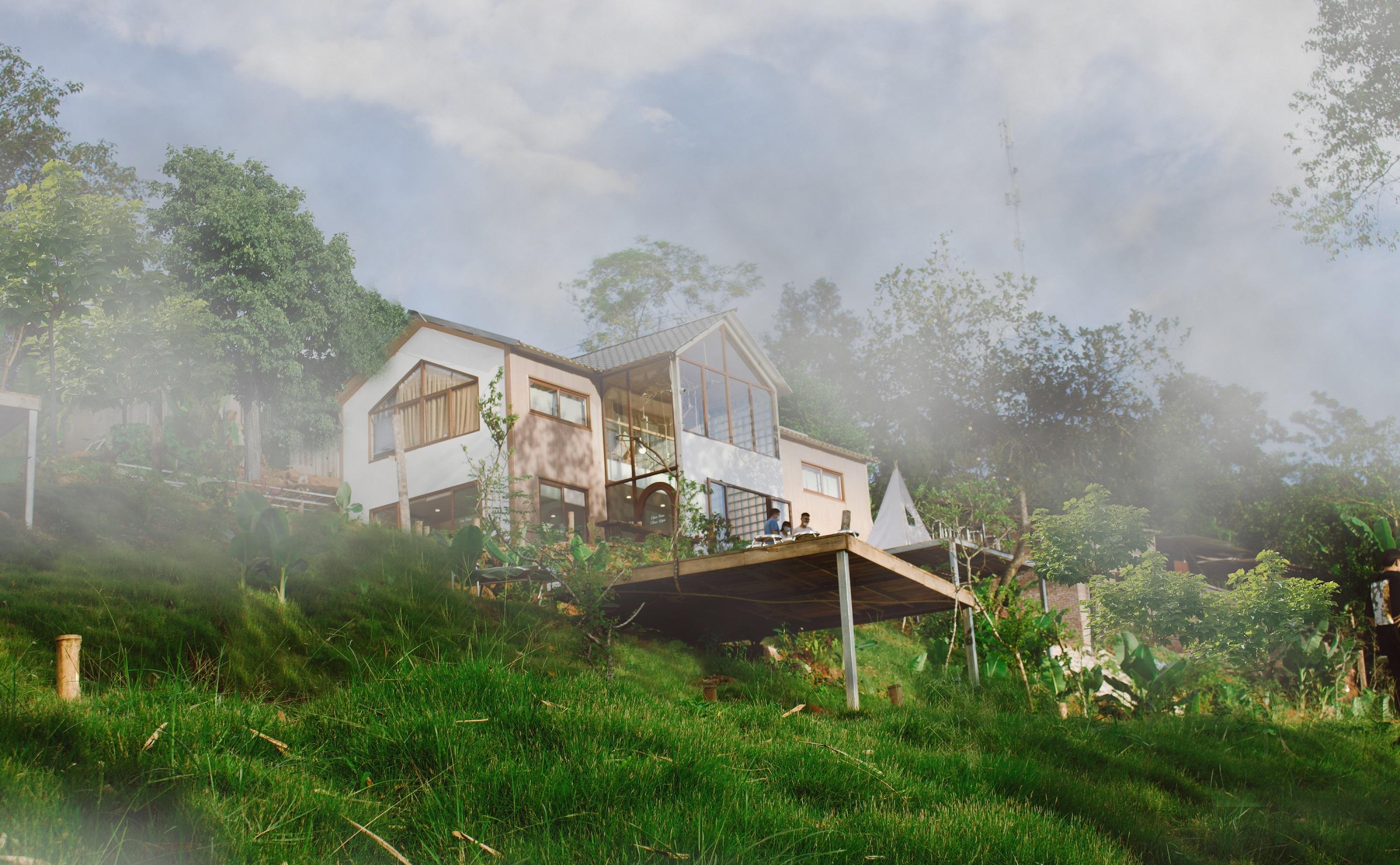 | Ngôi nhà hiện lên mờ ảo trong sương sớm rất lung linh. |