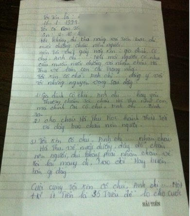 Nghe cô gái nói, bà Cần rất bất ngờ. “Chẳng biết những điều nó kể có bao nhiêu phần trăm là thật, vì mình có tận mắt chứng kiến đâu. Nhưng suốt hơn một tháng chăm bẵm gần gũi đứa bé, giờ mẹ nó nói bỏ con khiến tôi xót xa. Để chứng thực cho lời nói của mình, cô ta đã viết nguyện vọng vào giấy…”, bà Cần kể lại. Đáng chú ý, trong tờ giấy viết nguyện vọng cho con, cô gái bày tỏ “xin” người nhận nuôi 35 triệu đồng.