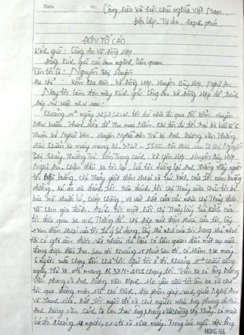 | Đơn tố cáo của chị Huyền. |