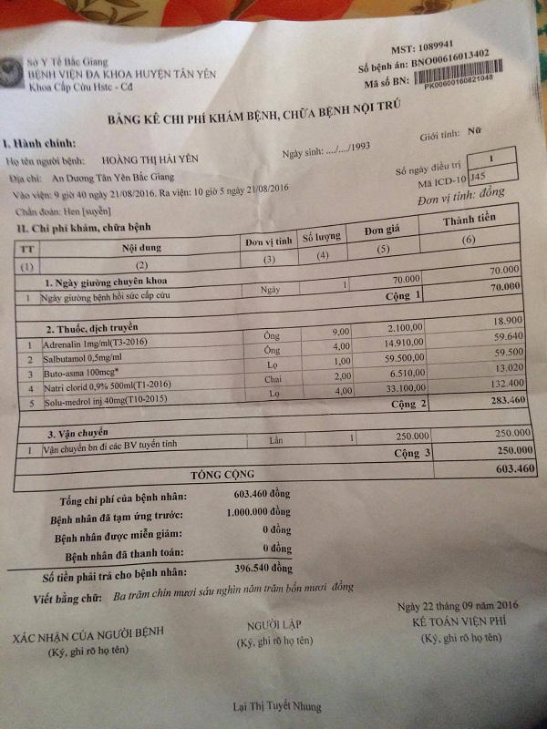 Sáng 21/8/2016, chị gái chị Trang là chị Hoàng Thị Hải Yến (SN 1993) lên cơn khó thở vì bệnh hen suyễn, gia đình nhanh chóng đưa chị Y tới BVĐK huyện Tân Yên để cấp cứu.
