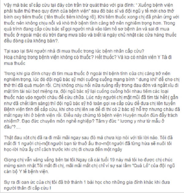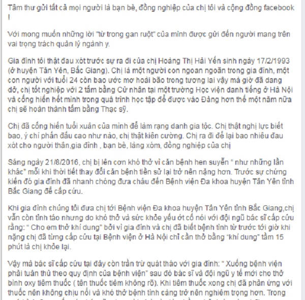 (PLO) - Sáng 11/10, chị Hoàng Thị Thùy Trang chia sẻ trên trang cá nhân của mình những dòng tố cáo bác sĩ của Bệnh viện đa khoa (BVĐK) huyện Tân Yên (Bắc Giang) tắc trách gây nên “cái chết không đáng có” của chị gái mình. Dòng chia sẻ khiến dư luận xôn xao.