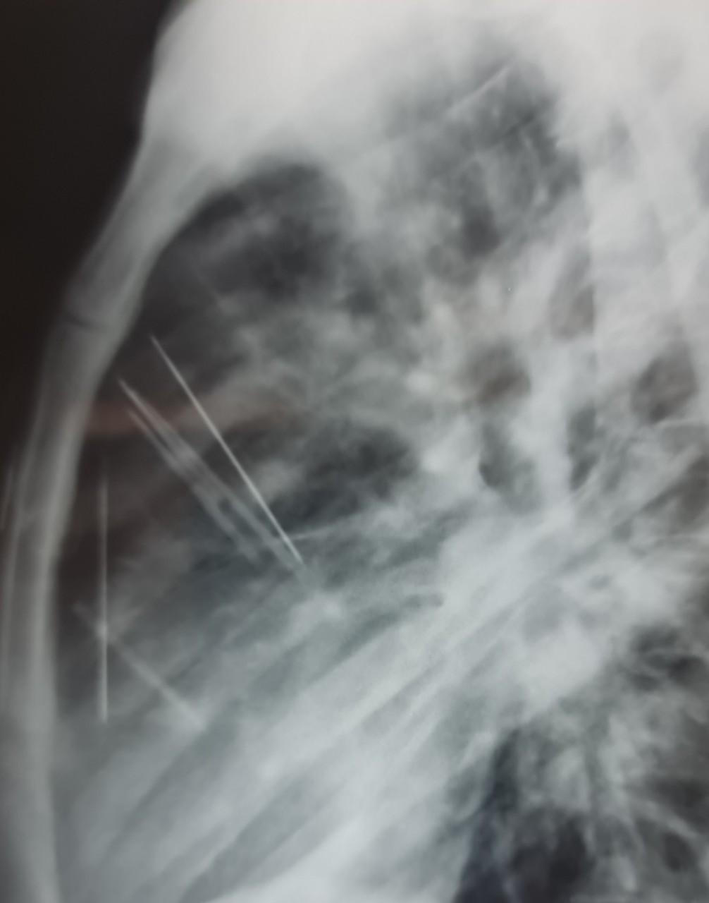 Phim chụp X-Quang 7 cây kim trong lồng ngực bệnh nhân H. Ảnh: KĐ