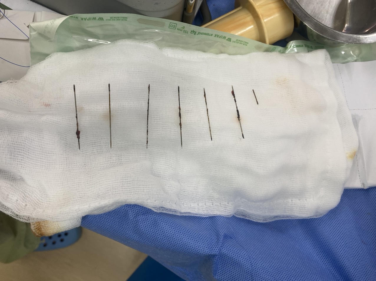 7 cây kim lấy ra từ ngực nữ bệnh nhân H. Ảnh: KĐ