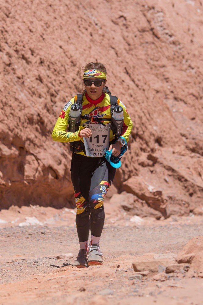 Vận động viên Vũ Phương Thanh trên hành trình vượt qua sa mạc. |