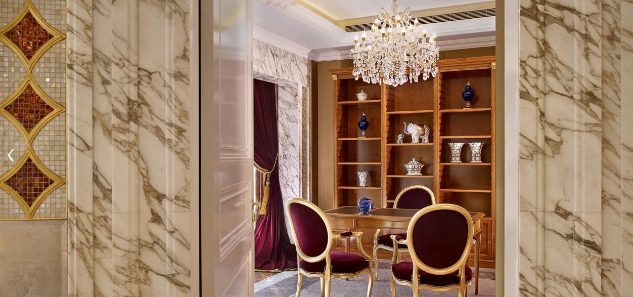 Như những phòng Tổng thống đẳng cấp khác, căn phòng này được trang hoàng bởi những vật liệu đắt giá như vàng, gỗ và đá hoa cương quý… tạo ra một không gian trải nghiệm tiện nghi và đẳng cấp, một điểm nhấn đặc biệt giữa khung cảnh của một trong những di sản đẹp nhất thế giới.