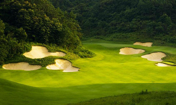 | Một sân trong chuỗi Mission Hills Golf Club tại Trung Quốc với đường lăn bóng hẹp và cây rừng là chướng ngại |