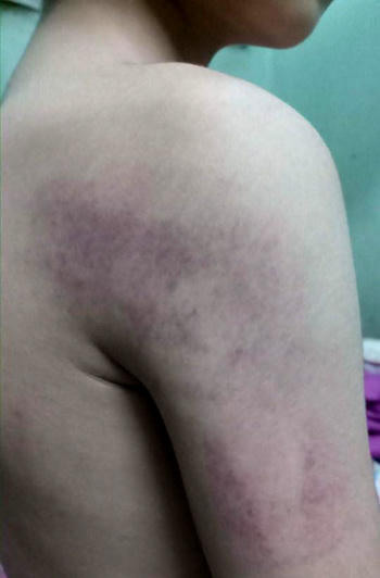 Bả vai và cánh tay học sinh bị tím bầm. Ảnh:Gia đình cung cấp. |
