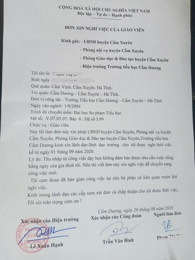 Lý do nữ giáo viên đưa ra là “Thu nhập từ công việc dạy học không đảm bảo được nhu cầu cuộc sống hàng ngày của gia đình tôi nên tôi viết đơn này xin nghỉ việc để chuyển sang công việc mới". Lá đơn đã được Hiệu trưởng và đại diện Công đoàn nhà trường ký xác nhận.