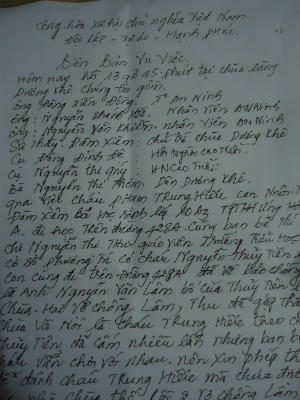 Ngồi bên cạnh, e ngại một hồi lâu, nạn nhân rụt rè nhớ lại: “Em vừa đi học về tới cổng chùa thì thấy vợ chồng cô Thu đứng chặn ngay ở cổng. Em chưa kịp hiểu ra chuyện gì liền bị chú Lâm đánh cho một cái vào mặt khiến đầu óc em choáng váng. Sau đó, chú Lâm tiếp tục đánh em một phát vào sau gáy, em ngã xuống xe, không biết gì nữa”. Hỏi vì sao bị đánh vô cớ như vậy mà không chạy, Hiếu nói: “Người ta có lỗi người ta mới sợ và chạy, em không có lỗi nên em cứ đứng im cho chú ấy đánh”.
