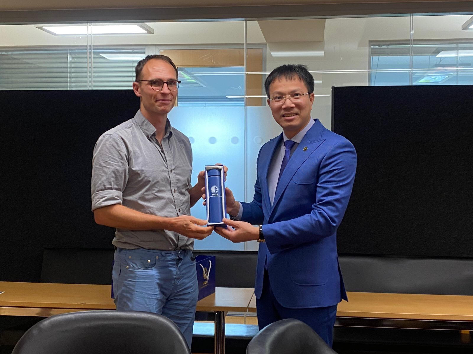 Hiệu trưởng Đoàn Trung Kiên tặng quà lưu niệm cho Giáo sư Matt Dyson, Giám đốc Trung tâm Luật châu Âu và Luật so sánh, Khoa Luật, Đại học Oxford |