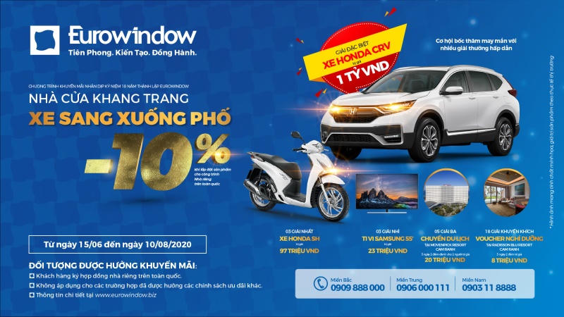 Nhằm tri ân khách hàng nhân dịp kỷ niệm 18 năm thành lập công ty, từ ngày 15/06 – 10/08/2020, Eurowindow triển khai triển khai chương trình khuyến mại “Nhà cửa khang trang – Xe sang xuống phố”.