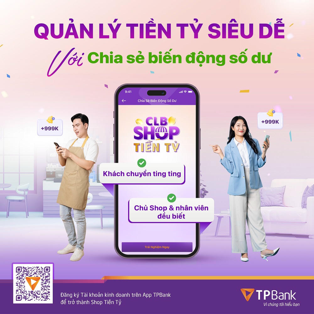 Ngoài ra, với App TPBank, việc quản lý dòng tiền chưa bao giờ đơn giản đến thế với tính năng Thông báo Biến động số dư, cho phép thông báo nhận tiền vào tài khoản song song cả trên thiết bị của chủ shop và của nhân viên. Mỗi khi tài khoản nhận được chuyển khoản QR, cả hai thiết bị đều được thông báo. Ưu việt hơn cả là tổng số dư và các giao dịch chuyển tiền đi từ tài khoản có thể được tùy chỉnh và giữ kín nếu như chủ shop không muốn chia sẻ.