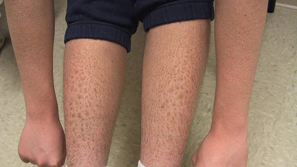 ● Làn da toàn thân bong vảy, nghiêm trọng nhất ở một số vùng như mặt duỗi của chi, cẳng chân nhưng không có tổn thương tại các nếp gấp.
