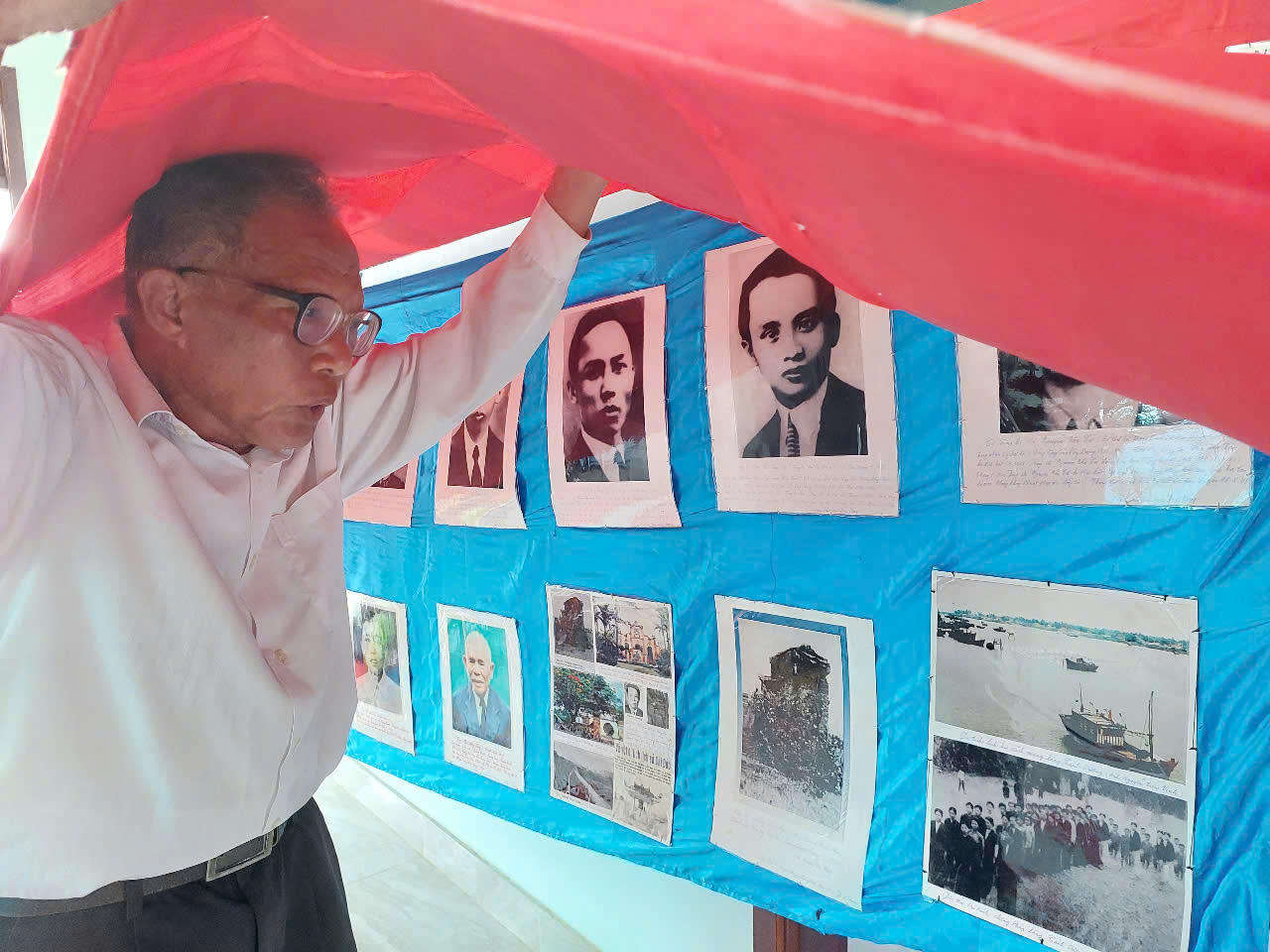 Ông Phong dán những tấm ảnh về Bác Hồ lên băng vải dài để thuận lợi cho việc trưng bày, giới thiệu. |